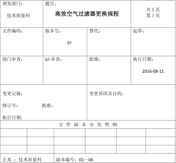 四、某制藥廠高效過濾器更換規程表格