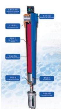 過濾器在過濾時,壓縮空氣先進入濾芯中間向四周擴散,經過濾芯過濾后進入濾芯與殼體的間隙,再通過過濾器出口排出下游。壓縮空氣中的固體懸浮物被濾芯(纖維)捕捉后留在內部、液體(如凝結水、油霧等)被濾芯(纖維)捕捉后由于其重力的作用流至濾芯低部,通過海綿的“潮濕帶”(在“潮濕帶”處由于壓力降較大沒有空氣流過,故稱為“安靜區”,流至過濾器殼體底部,由自動排水器排至外界。