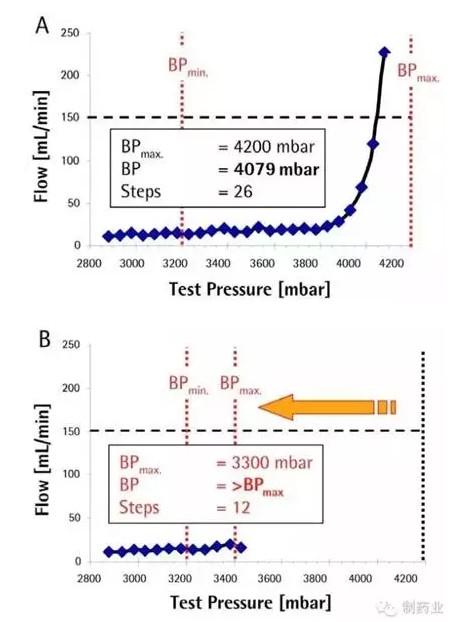 在第一張圖(圖4A)中,預先設定的最小泡點值BPmin 為3200 mbar,最大泡點值BPmax 為 4200 mbar。在4079 mbar 時測得泡點, 總共需要26級壓力水平。在第二張圖( 圖4B)中,將最大泡點值BPmax 降低為3400mbar。這就意味著,一旦達到設定的最大泡點值BPmax,Sartocheck®4 plus就會終止測試,并顯示信息:“測試通過,BP>BPmin”。如上所述,最小泡點值是唯一作為判定泡點測試結果的關聯指標;然而最大泡點值BPmax 與測試結果判定毫無關系。實質上,最大泡點值BPmax 僅僅反映了終止測試(結果通過)的最大測試壓力。在上面的例子中,只需要12 級壓力水平;經過換算,即所需的測試時間縮短了50% 以上。
