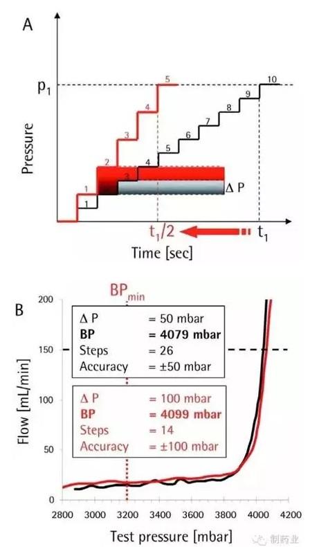 圖5 改變BP 測試的壓力增量水平,將壓力增加步長從50 mbar 提高至100 mbar,只需要一半的測試時間,就能夠分別達到所需的壓力