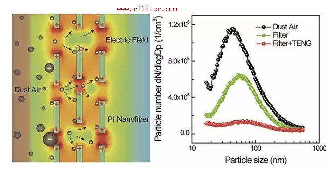 圖1. 過濾器去除空氣中PM的原理和不同過濾器對PM的去除效果。(左)R-TENG增強的PI納米纖維過濾器去除空氣中PM的原理示意圖;(右)不同過濾器對PM的去除效果對比圖。