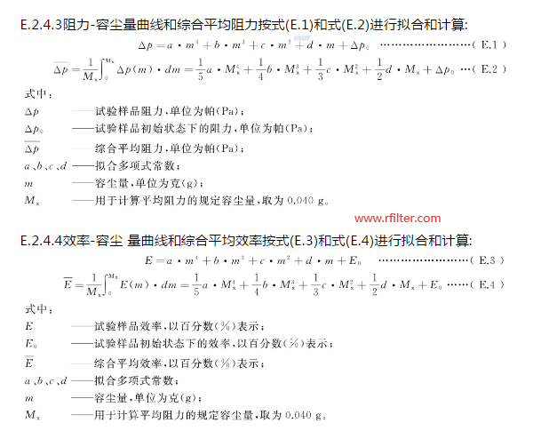 E.3.4.3阻力容塵量曲線和綜合 平均阻力按式(E.1)和式(E.2)進行擬合和計算,效率-容塵量曲線和綜合平均效率按式(E.3)和式(E.4)進行擬合和計算。其中,用于計算平均阻力的規定容塵量(Mx)為50 g。